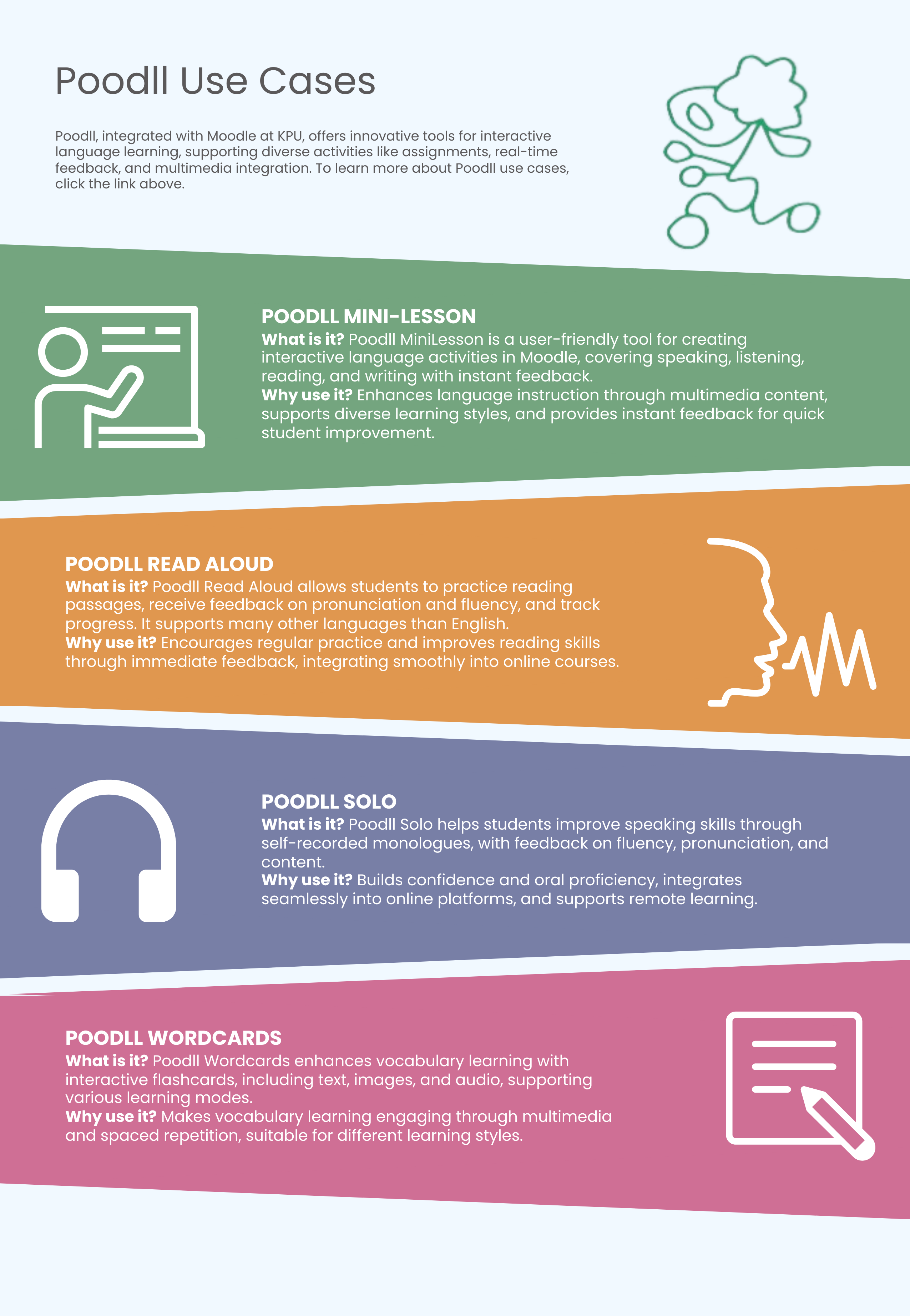 Poodll is directly integrated with Moodle (KPU's Learning Management System). Poodll has enabled 4 tools that allows KPU educators and students to communicate more easily, MiniLesson, ReadAloud, Poodll Solo, and Cloud Poodll.