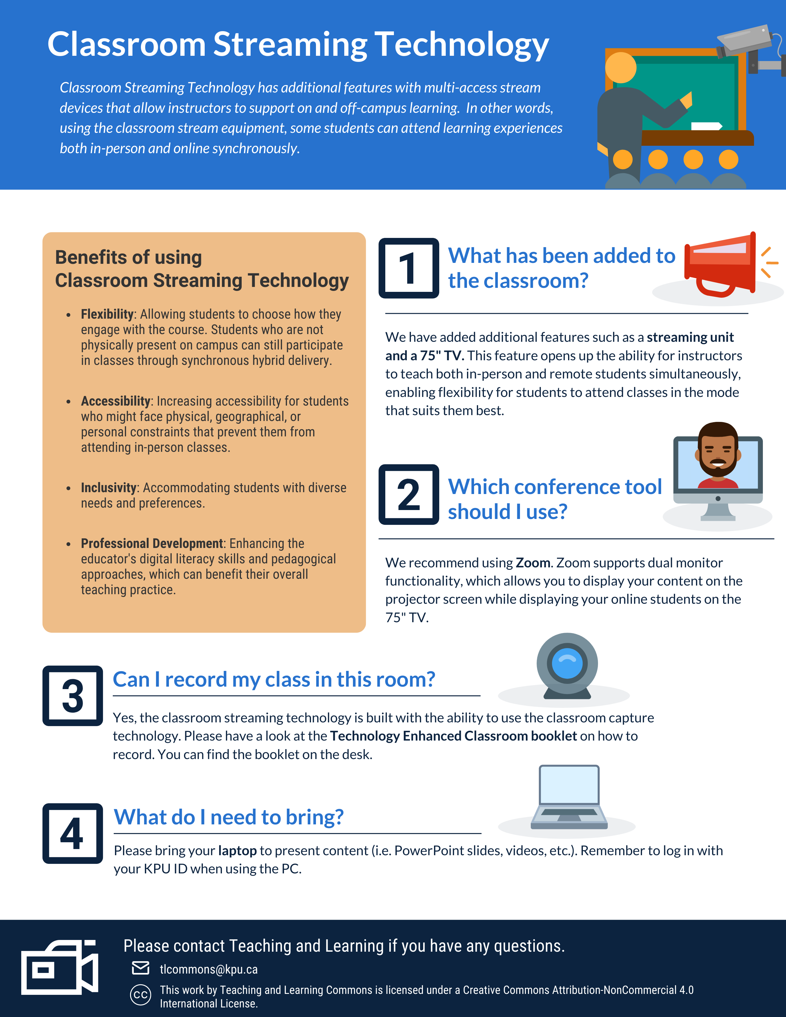 These classrooms have additional features with multi-access stream devices that allow instructors to support on and off-campus learning.  In other words, using the classroom stream equipment, some students can attend lectures both in-person and others online synchronously.