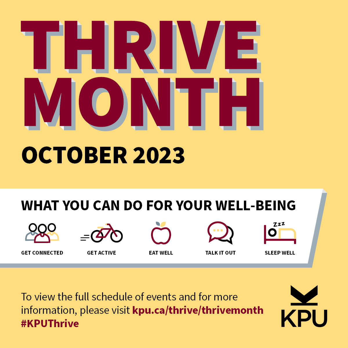 Every year in October, KPU celebrates THRIVE, which is a series of events, workshops and activities that focus on supporting positive health and wellbeing for students, staff, and faculty.
