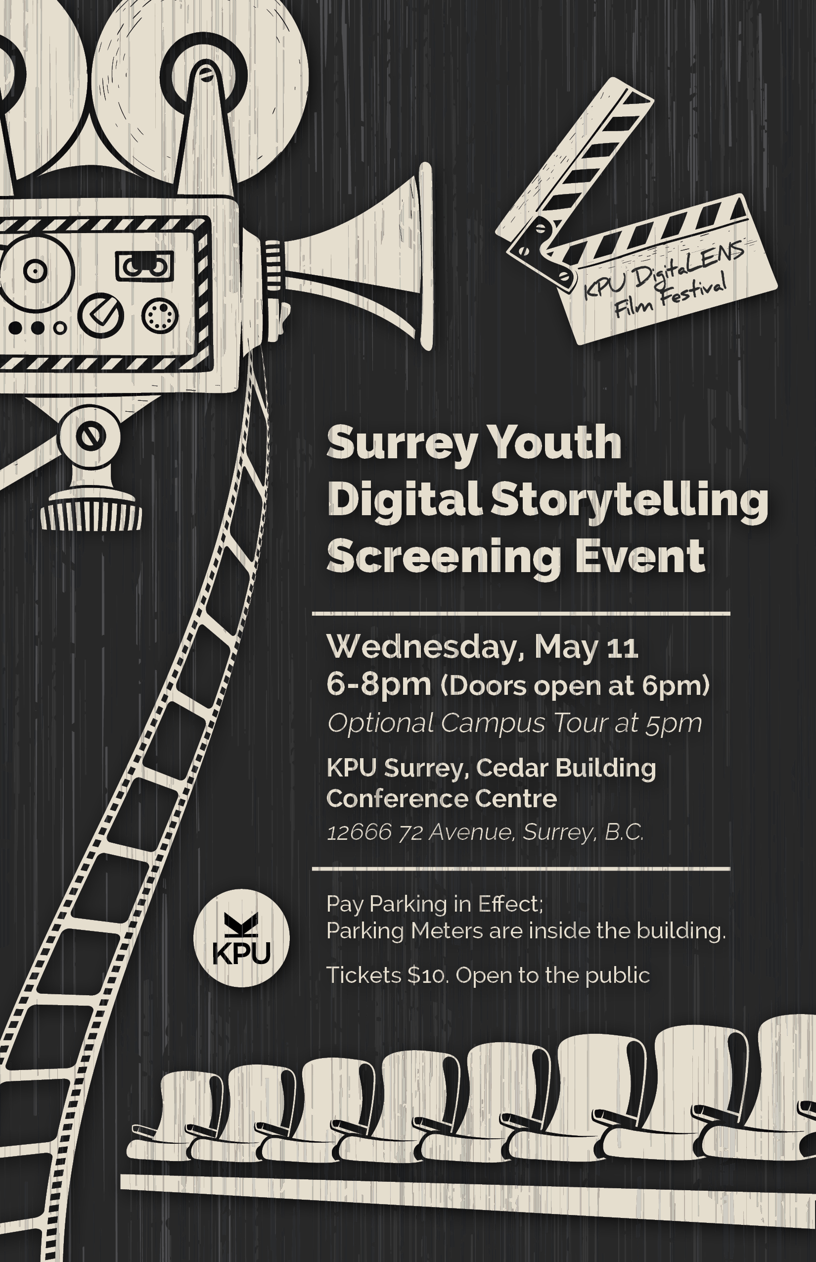 DigitaLENS: a community partnership with The Visual Media workshop, The Surrey School District, Princess Margaret Secondary School and Kwantlen Polytechnic University with generous funding by Telus. DigitalLENS Club: Digital Literacy Education for Novice Storytellers Digital Stories of Surrey Youth to Challenge Media Discourses on Youth Life in Surrey Mass media images of youth life in Surrey are stereotypical where everyday life is reduced to gang violence, youth victimization, and cultural and religious conflicts. What images of everyday life would we see if Surrey youth could control the cameras and tell the stories themselves? DigitaLENS brings together digital storytelling instructors and mentors with a group of grade 8-12 Surrey high school students. DigitaLENS instructs these students in digital storytelling techniques so that young people can tell their stories—the real stories—that challenge the negative mass media images of youth life in Surrey. These digital stories will be showcased on the Visual Media Workshop website, and tonight at the first KPU DigitaLENS Film Festival. What is Digital Storytelling? Digital Storytelling is the creation of short movies (2-5 minutes typically) incorporating photographs, video, animation, sound, text, and often the narrative voice of the person who makes the video. There are many different goals of digital stories: to tell a personal narrative or life experience, describe a life event or trip, or narrate a story for a particular cause (often related to social justice). Our students have produced digital stories related to social justice in the following themes: Narrative & Identity, Community & Care and Passion & Talent.